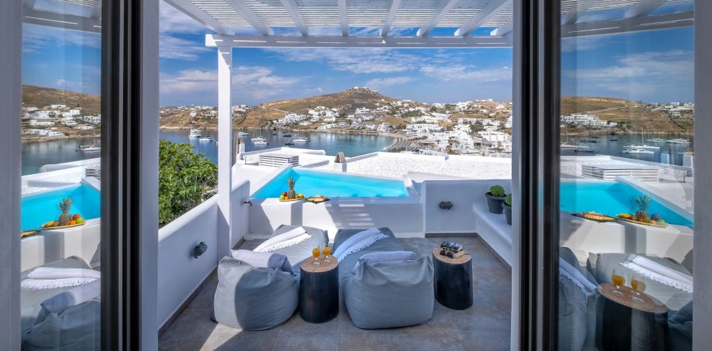 Τhis amazing suite is located on the 4rth floor of our premise, offering modern amenities and a great infinity pool with stunning views of Ornos Bay. The suite is 30 sq.m. has a king size bed, a bathtub and a spacious private balcony.