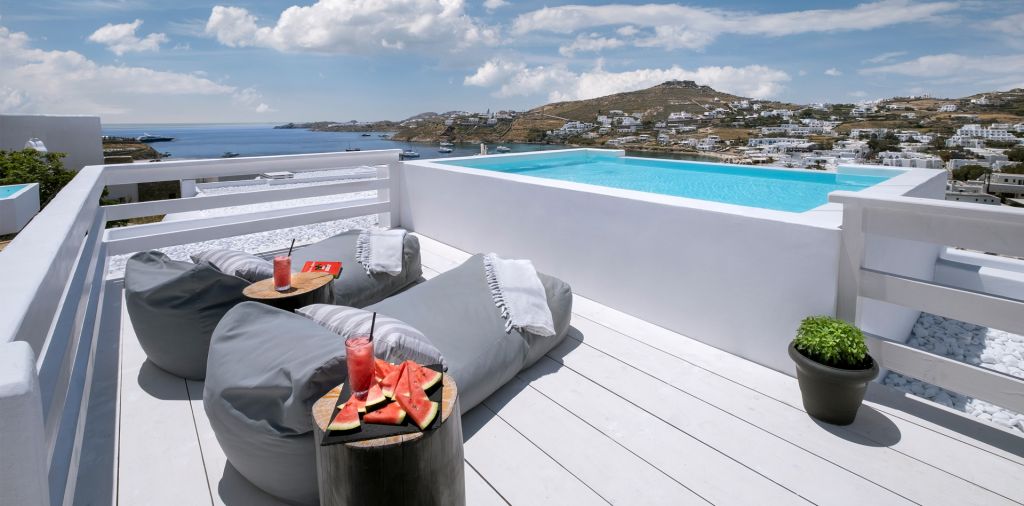 Located at a central spot on the upper levels of our premise this up style suite is overlooking the beautiful bay of Ornos, offering stunning and panoramic views that will leave you speechless. Enjoy the comfort of your spacious infinity pool and relax on your beautiful terrace. The suite offers a king size bed, a sofa bed, a bathtub and exclusive amenities.
